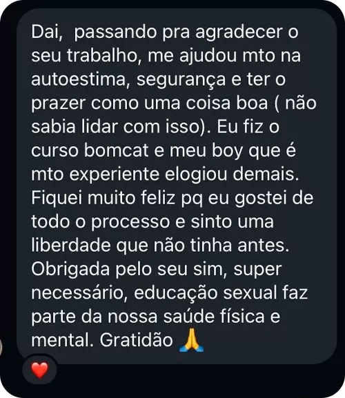 Eu dedico todos os dias da minha vida para estudar e trabalhar com o que eu amo, ajudando tantas mulheres a perderem sua insegurança e viverem plenamente suas vidas sexuais e relacionais.